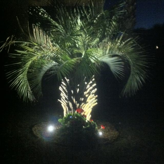 Oberst Landscaping has been lighting up landscapes since 1988. With outdoor lighting you can extend the time you enjoy your landscape and out door spaces. Water features, statues, specimen plants and the outside of your home are the obvious choices to light as well as pathways. When you light up your special features in your landscape you need to make sure you see what is lit and not the fixture itself, in other words no glare. When choosing outdoor lighting make sure you check what material is used, many fixtures will not last in the Florida environment. We alays use LED bulbs instead of halogen bulbs. On average the LED bulbs last ten times longer and the cost to run them is ten times less then halogen bulbs. Many returning customers are coming to us to switch their halogen bulbs to LED bulbs. Our fixtures are also proven to last in FLorida. Without you having to woory about replacing them every couple of years. Color lighting is now a great way to accent your home at night. Our system using color change bulbs come with a remote letting you control which color the light is which can be anything from a nice soft white to any color in the rainbow. You can also have the lights chang colors and can pick how quickly they do so you can even adjust the brightnes of the bulb. THese lights work great for holiday lighting also since they would let you keep the lights white most of the year if you wanted and only use the colors for special occasions like Christmas. Below are many examples of what can be done.